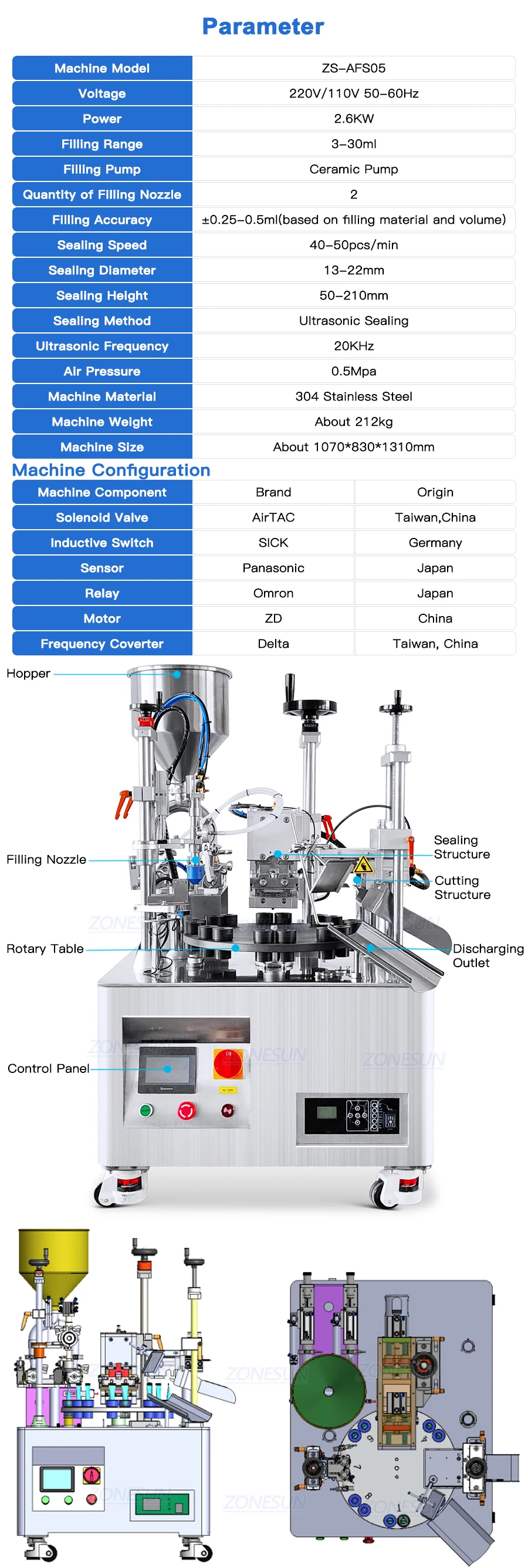 ZONESUN ZS-AFS05 АВТОМАТИЧЕСКИЙ УЛЬТРАЗВУКОВОЙ КЕРАМИЧЕСКИЙ НАСОС ДЛЯ НАПОЛНЕНИЯ И ЗАПЕЧАТЫВАНИЯ ПАСТ В ТЮБИКА